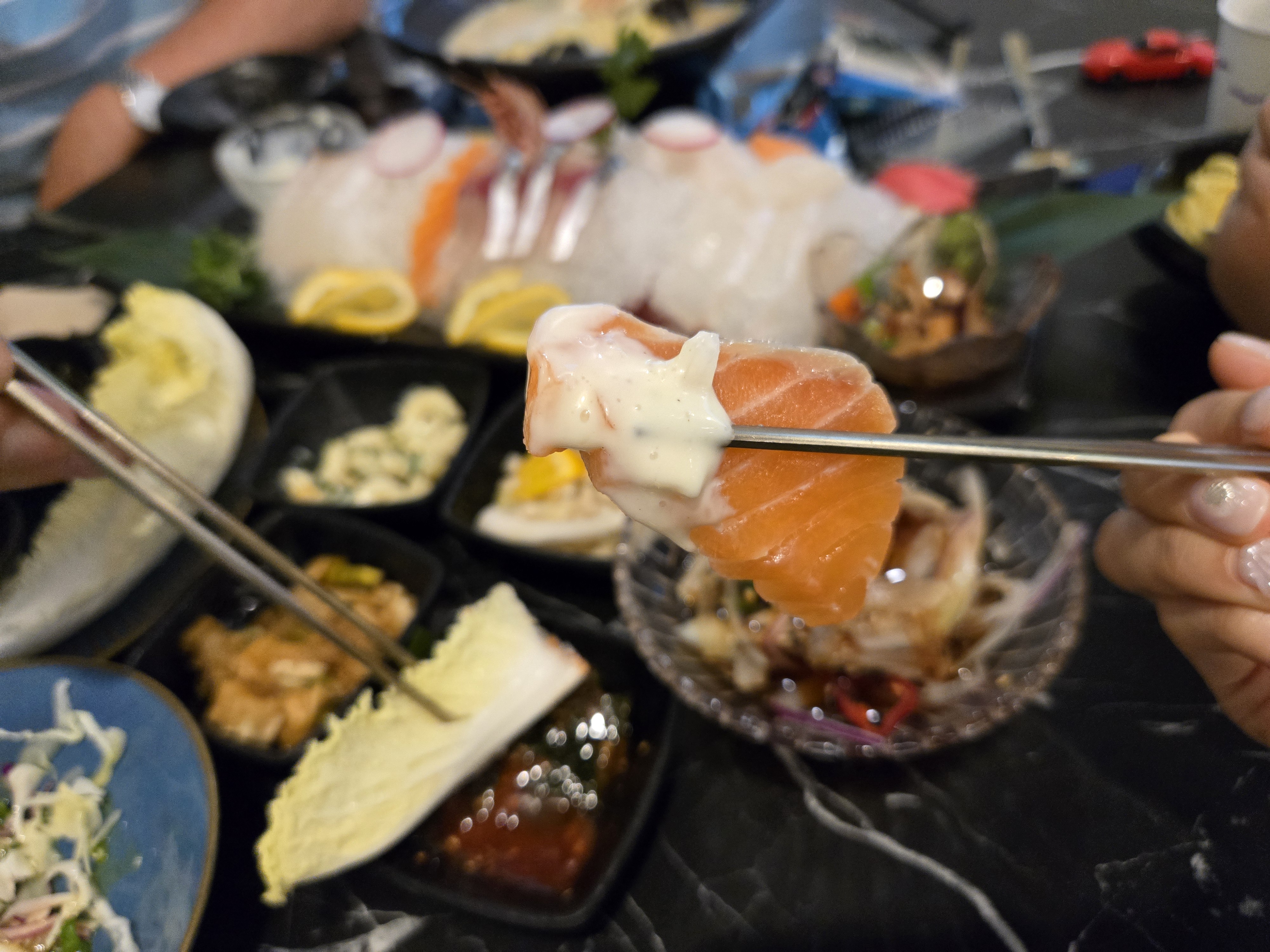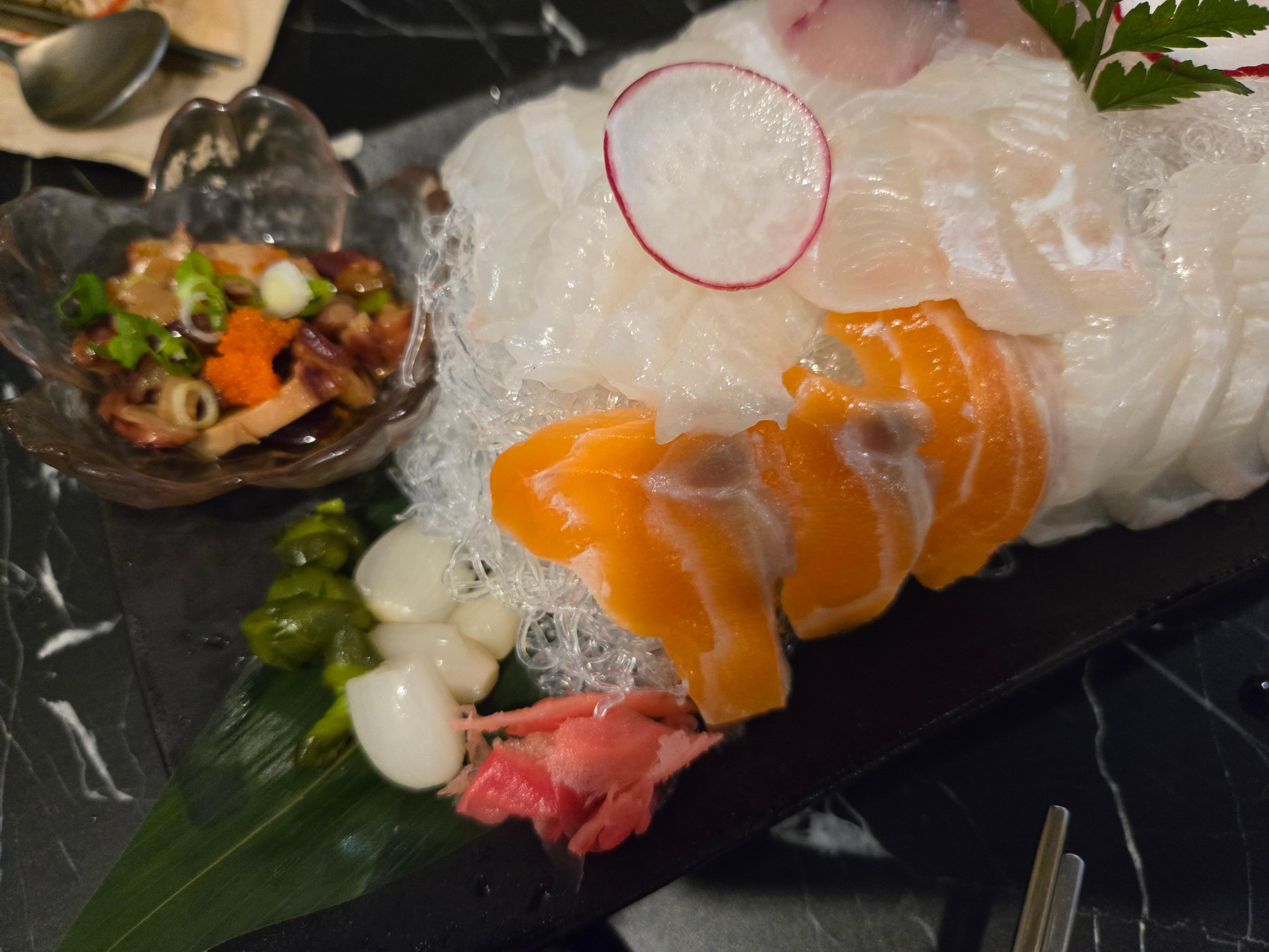연어와 제주광어회, 고등어회와 딱생우가 아름답게 데코된~ 아름다운(?) 모듬회였다.