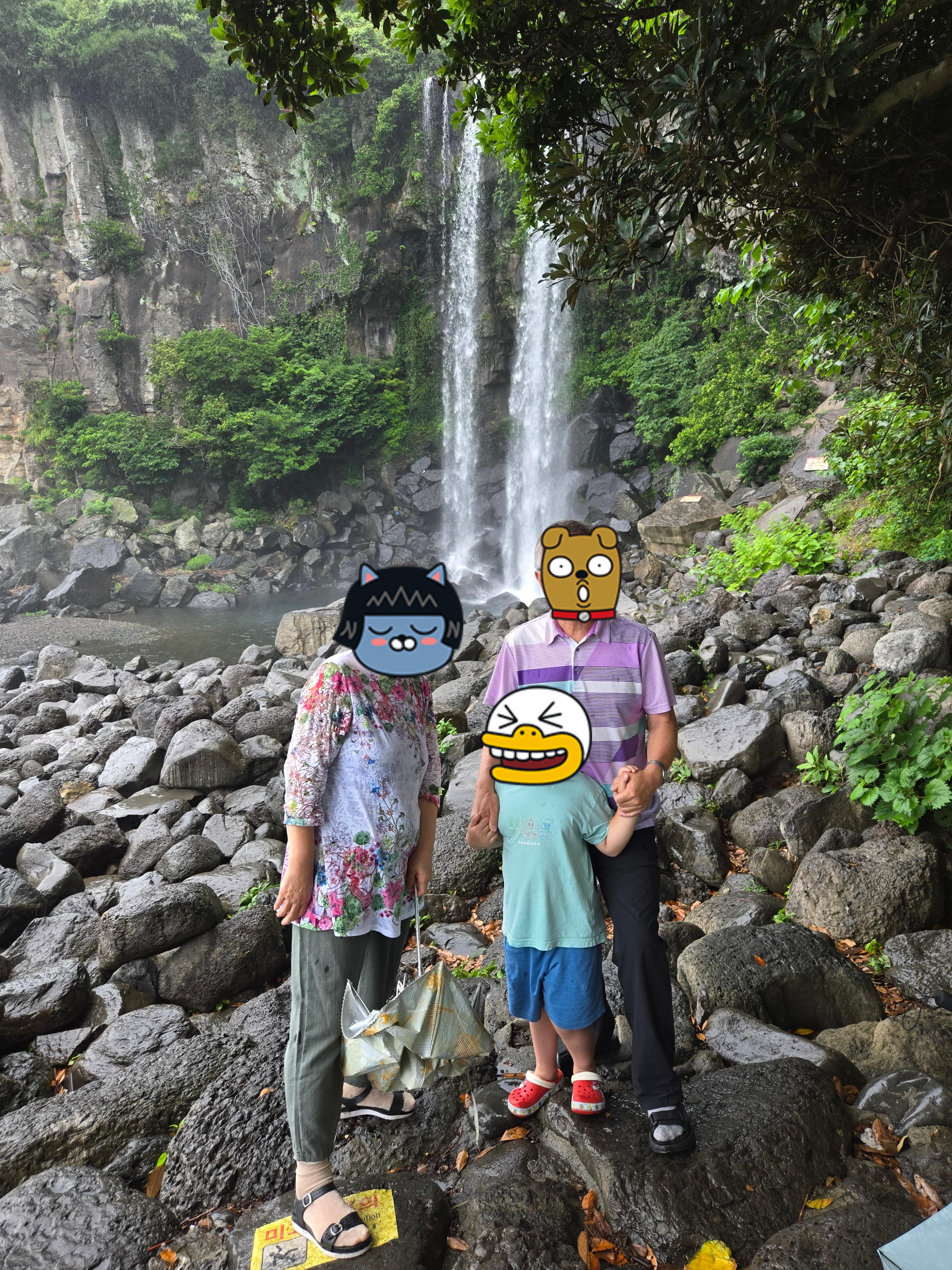 비가 와서 좀 위험하긴 했지만 조심히 내려와서 정방폭포 앞에서 사진도 남기고~