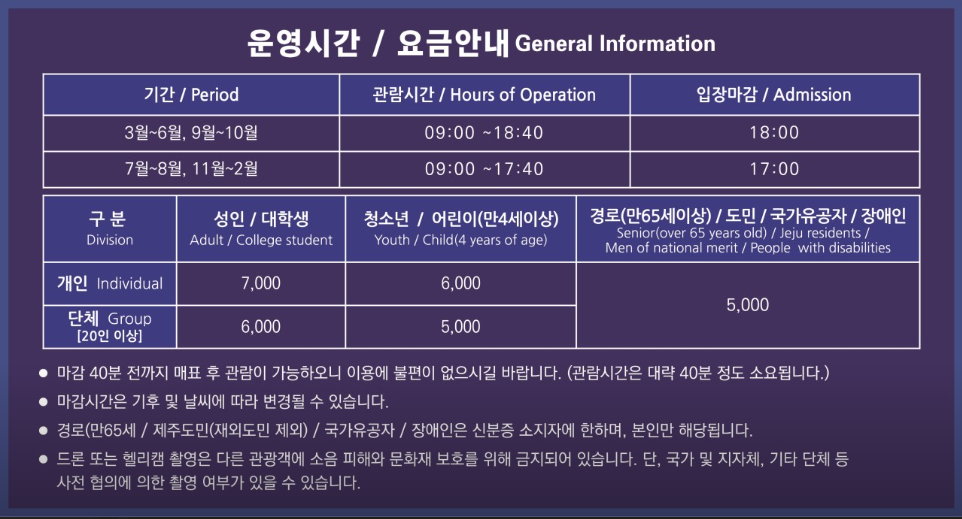 -영업시간: 3~6월 9~10월 매일 09:00 - 18:40 (입장마감 18시),