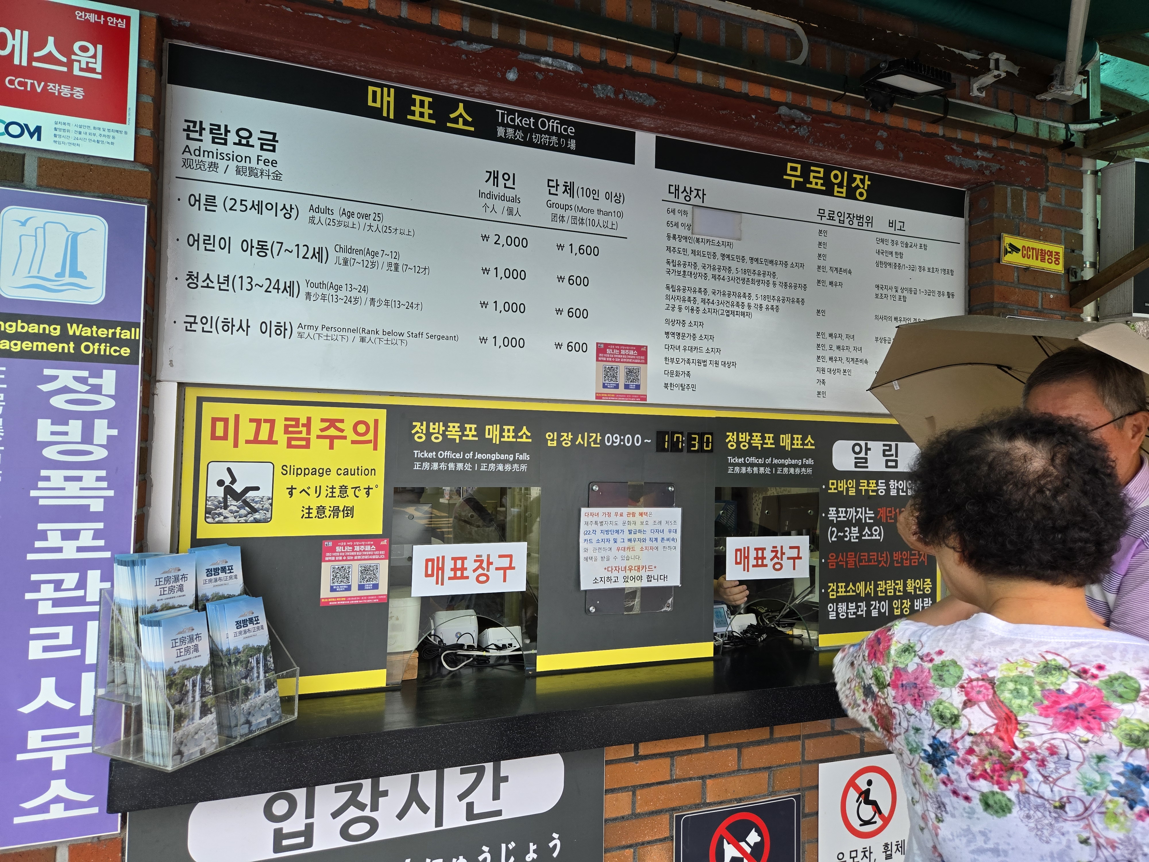 부모님과 아들은 유인매표소에서 경로할인과 어린이임을 증명하고 표를 구매했다.